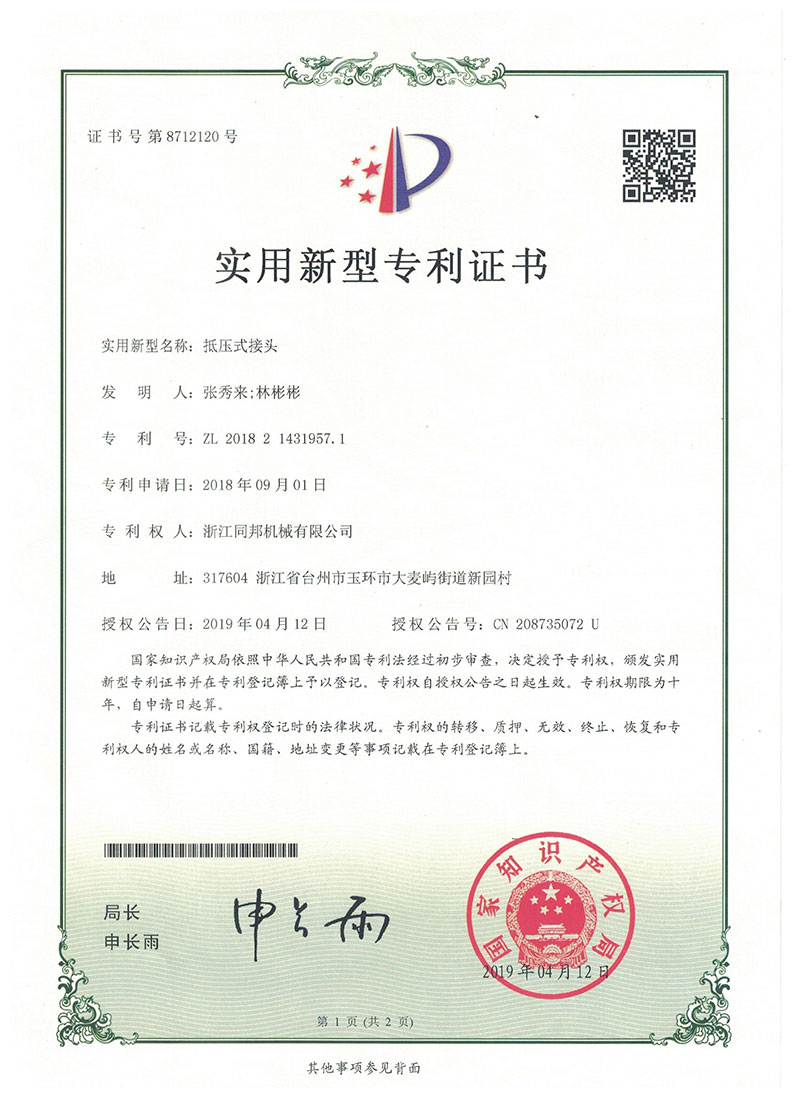 浙江同邦機械有限公司是一家主要生產液壓流體連接件、卡套式管接頭、過渡接頭、軟管接頭、軟管總成、硬管總成、油缸頭、汽車零部件,集研發、制造和銷售為一體的綜合性公司。我們擁有專業的設備和技術人員,并且通過IATF16949國際質量管理體系認證和8項產品專利。